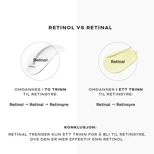 - Ретиналь вважається ефективнішим за ретинол завдяки своїй близькій хімічній структурі до ретиноєвої кислоти — активної форми вітаміну А в шкірі. Це пов’язано з тим, що ретинол повинен перетворитися на ретиналь, а потім на ретиноєву кислоту в шкірі, перш ніж почати діяти, тобто саме ретиноєва кислота виконує роботу всередині шкіри.